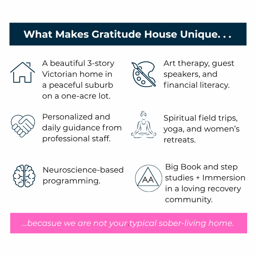 The mission of Gratitude House is to reduce the relapse rate by providing a safe, supportive, and beautiful sober-living home for women committed to 12-step recovery.