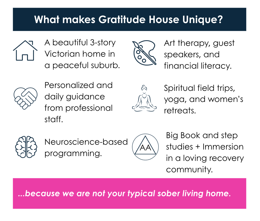 The mission of Gratitude House is to reduce the relapse rate by providing a safe, supportive, and beautiful sober-living home for women committed to 12-step recovery.