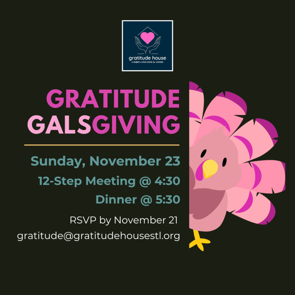 Join us for Gratitude Galsgiving — an evening of Thanksgiving, recovery, and connection.At Gratitude House, we’re grounded in the spiritual practice of gratitude and the principles of 12-Step recovery. We know that isolation fuels addiction — but connection keeps us sober. That’s why we open our doors to women across the community to share this season of thanks with our residents. The night begins with a 12-Step meeting at 4:30 PM, followed by a Thanksgiving dinner filled with great food and even better fellowship. 🗓️ Sunday, November 23📍 4:30-6:30pm. Location shared upon RSVP📩 RSVP by November 21: gratitude@gratitudehousestl.org